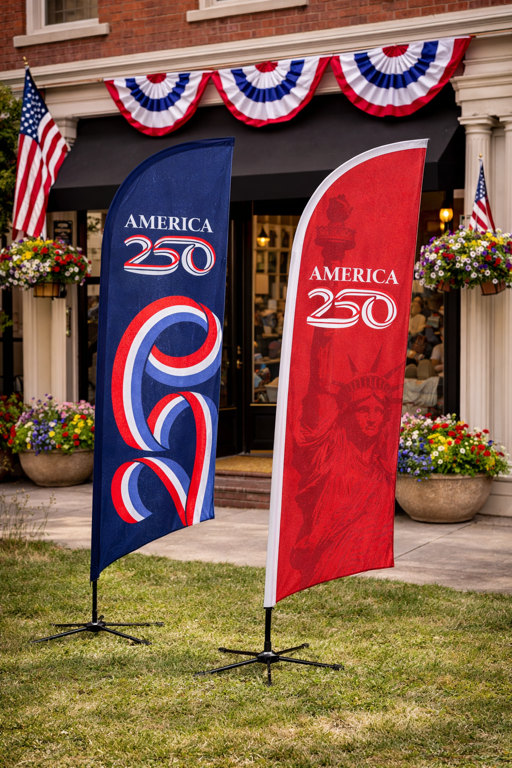 The America250™ Tail Feather Flag delivers bold vertical visibility with fast turnaround, durable construction, and proven performance for indoor and outdoor environments.